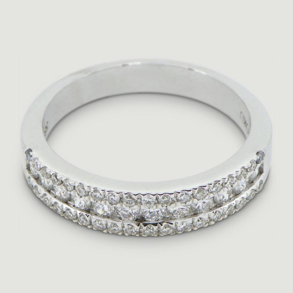 Make a statement with our Radiant Trio Diamond Ring. Three rows of round diamonds grace this wide band, offering a captivating display of sparkle and shine. Featuring micro-pavé outer rows and a channel-set central row, this ring is a symbol of timeless beauty and sophistication, adding a touch of glamour to any ensemble.