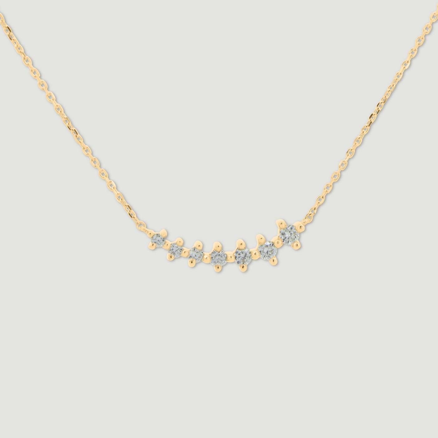 A graceful embodiment of sophistication. Seven exquisite diamonds amounting to 0.21Ct, gracefully nestled within a 18ct yellow gold claw settings, create a captivating curved design reminiscent of a gentle smile. The necklace is attached at both ends to a delicate diamond-cut chain, adding a touch of sparkle to its chic silhouette.Adorn your neck with this timeless piece, a tribute to refined taste and understated luxury.