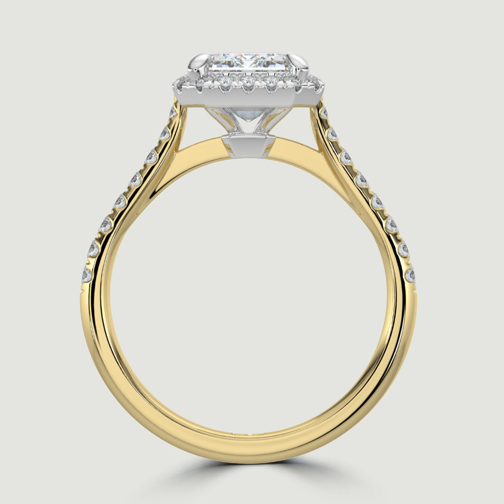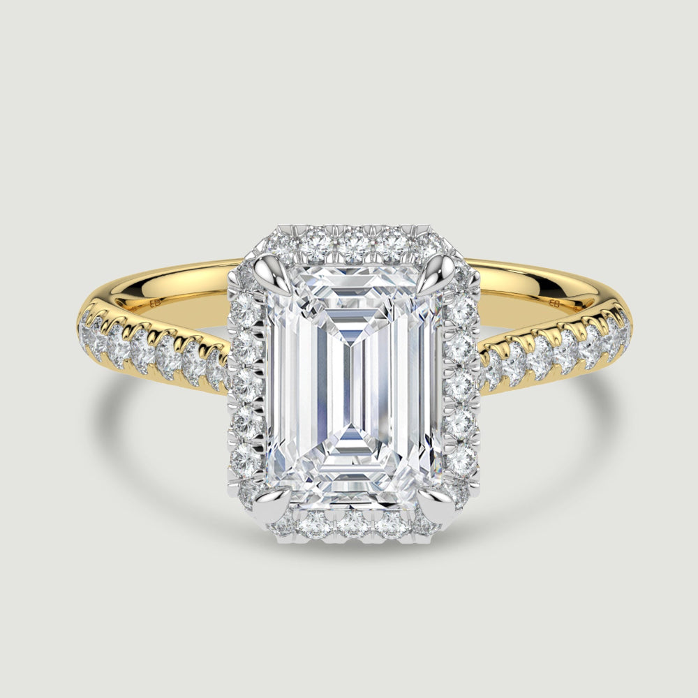 A refined two-tone design, this ring pairs an 18ct yellow gold band with a platinum setting and halo, creating a striking contrast that enhances the brilliance of its emerald-cut lab-grown diamond.