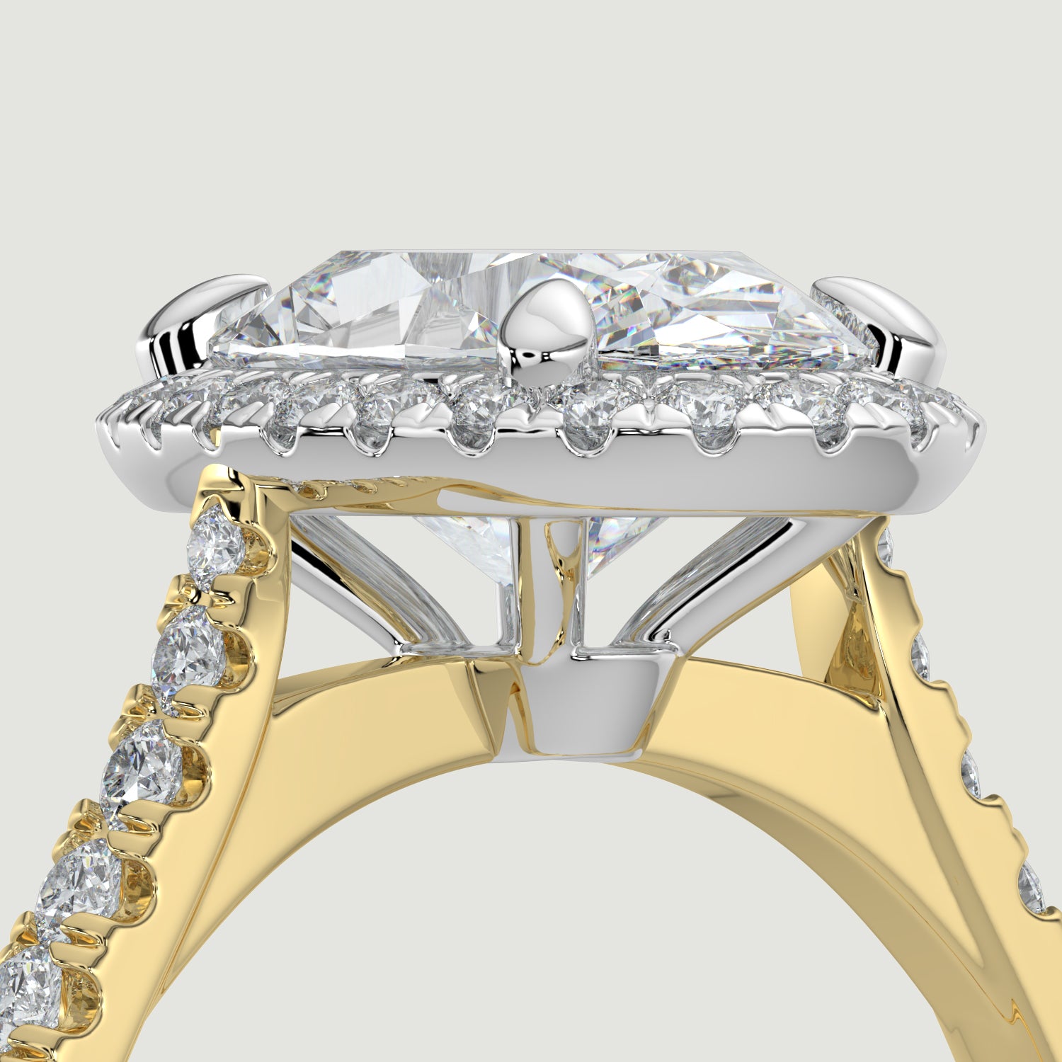 The halo diamonds are precisely angled to follow the graceful curves of the oval stone, adding an extra layer of sparkle from every perspective. The warm glow of yellow gold and the cool brilliance of platinum combine to create a design of exceptional beauty.