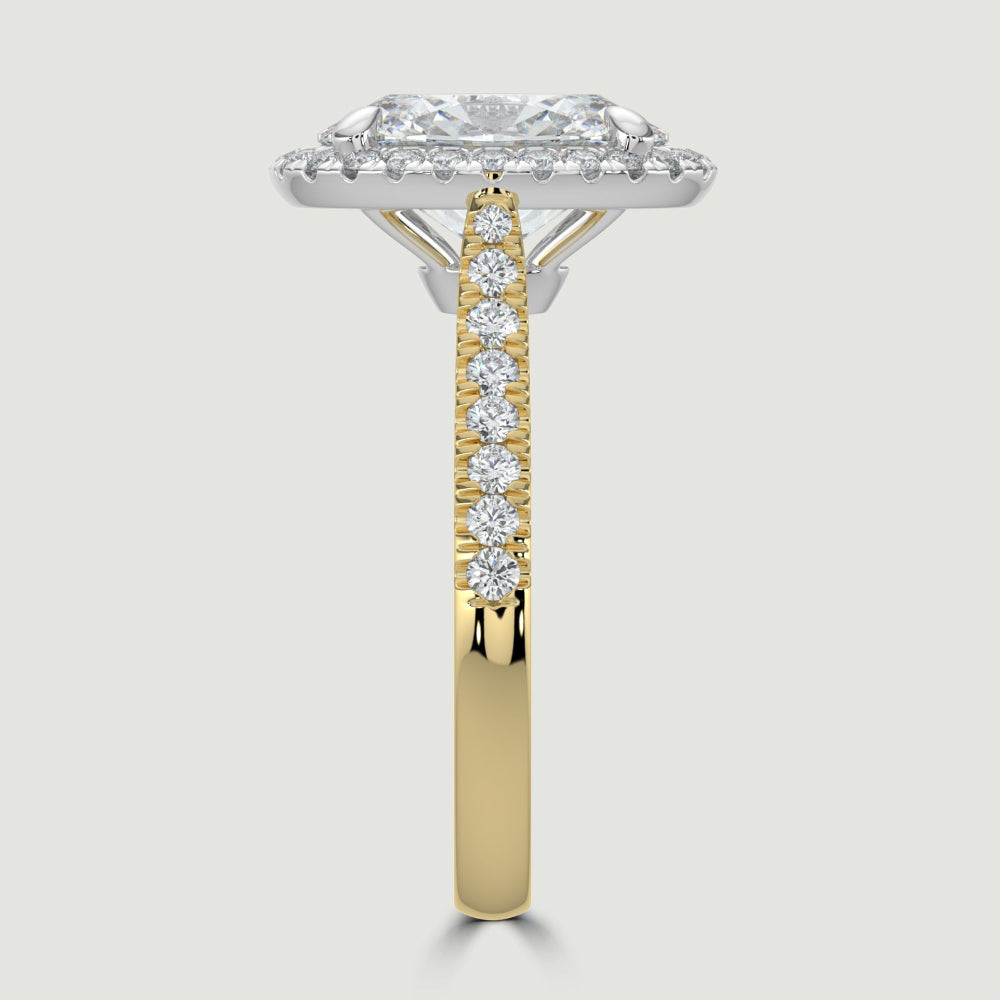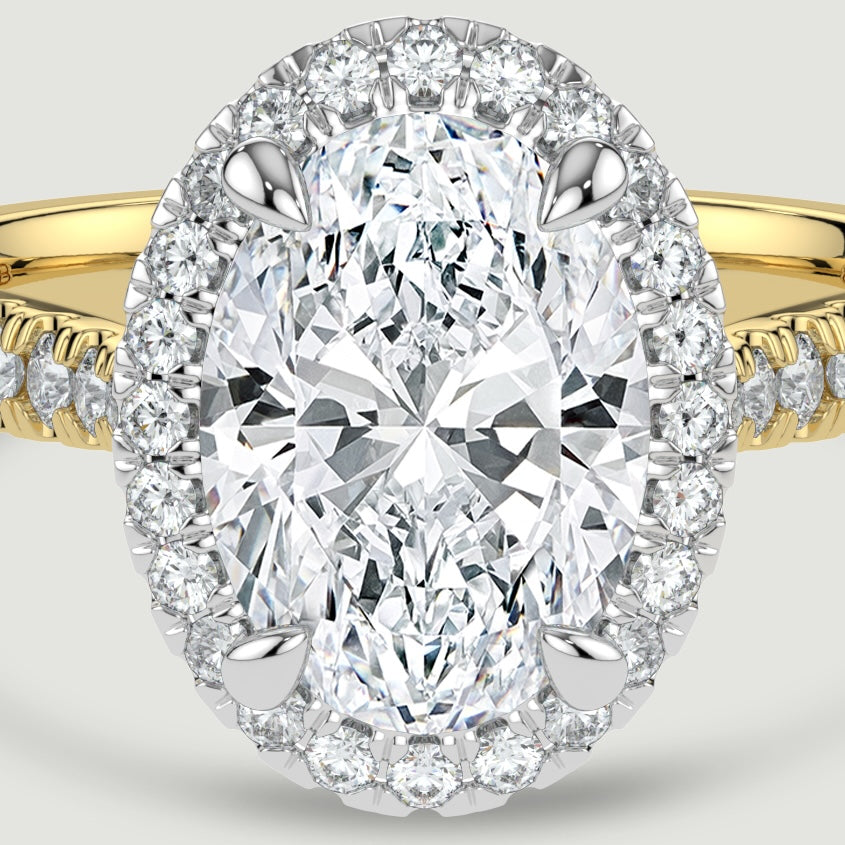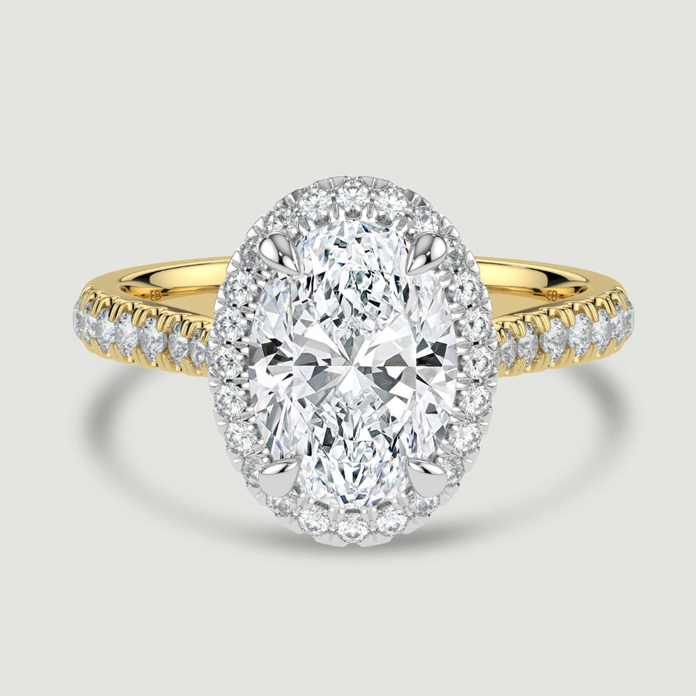 A harmonious blend of warmth and sophistication, this two-tone ring features an 18ct yellow gold band paired with a platinum setting and halo. At its centre is an elegant oval-shaped lab-grown diamond, beautifully complemented by a halo of 1.1mm diamonds that enhances its size and brilliance.