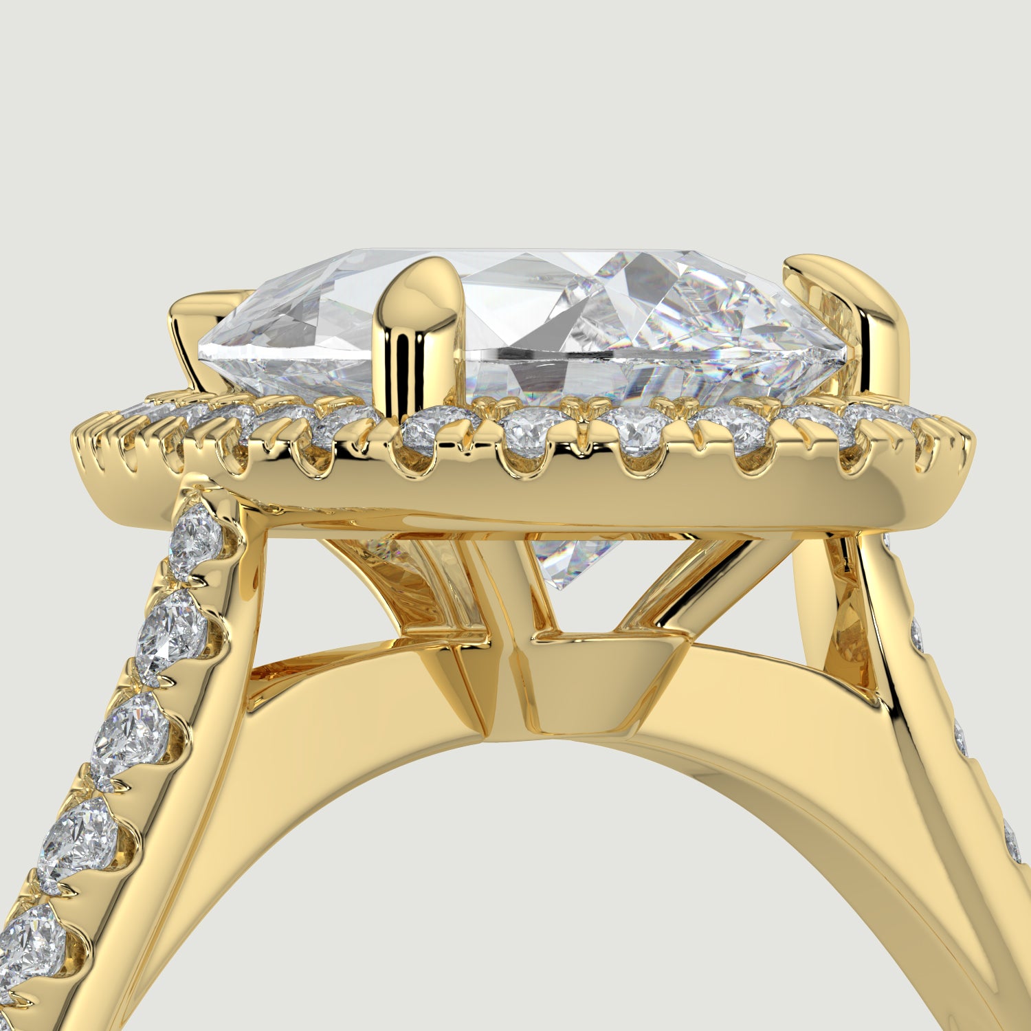 Each halo diamond is set at a subtle angle, creating an exquisite sparkle that highlights the design from every perspective. The yellow gold band adds a touch of classic charm, perfectly balancing the dazzling brilliance of the diamonds.