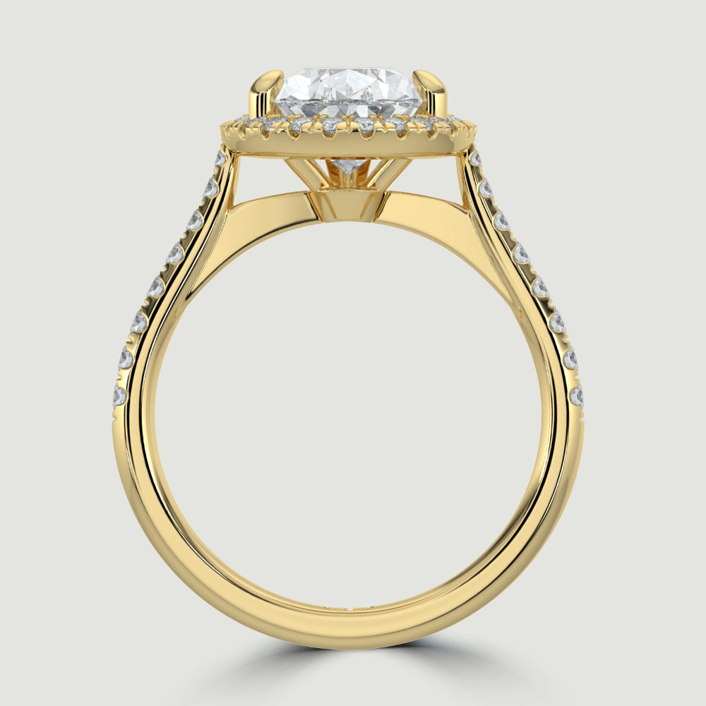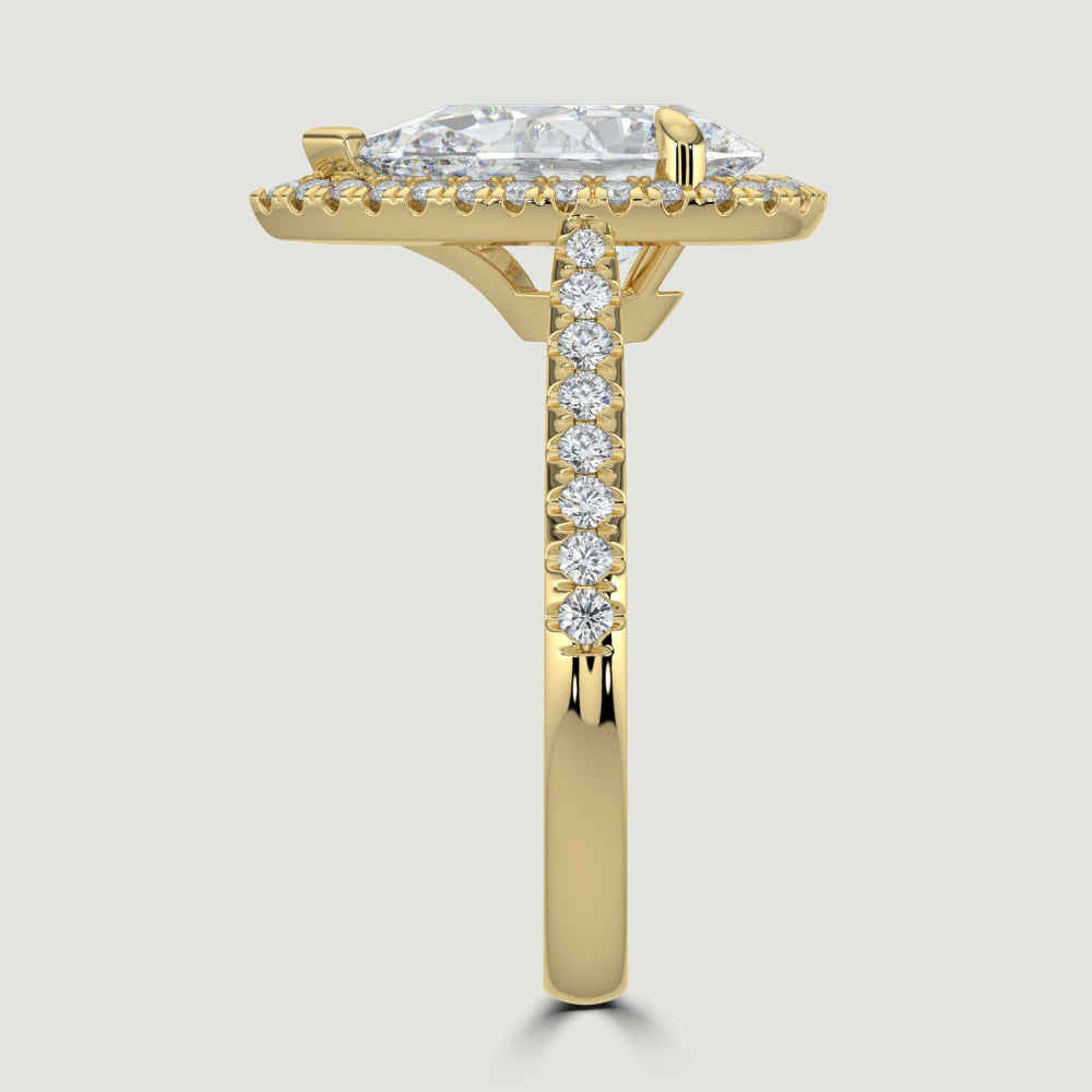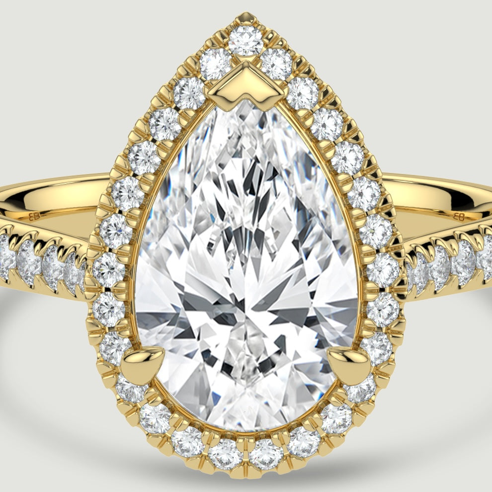 This 18ct yellow gold ring exudes warmth and sophistication, featuring a pear-shaped lab-grown diamond as its centrepiece. A halo of 1.1mm diamonds surrounds the main gem, precisely crafted to enhance the pear shape’s graceful curves while drawing the eye to its brilliance.
