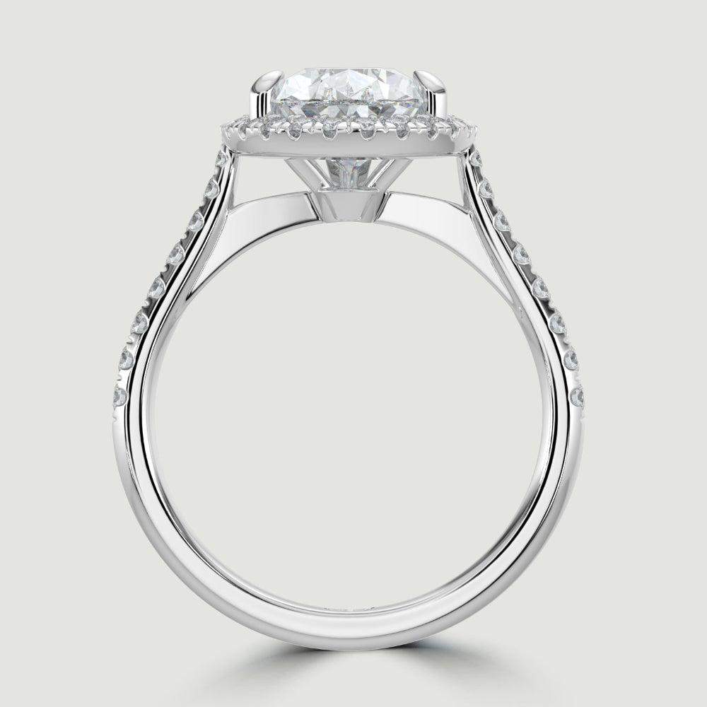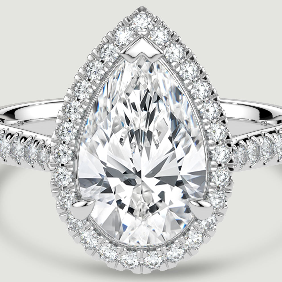 Graceful and distinctive, this platinum ring showcases a stunning pear-shaped lab-grown diamond at its centre. Encircling the central gem is a delicate halo of 1.1mm diamonds, custom-made to perfectly complement the elegant teardrop silhouette.