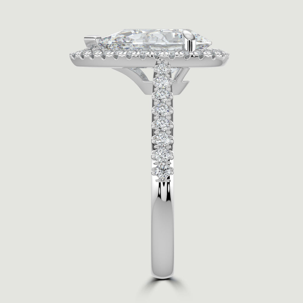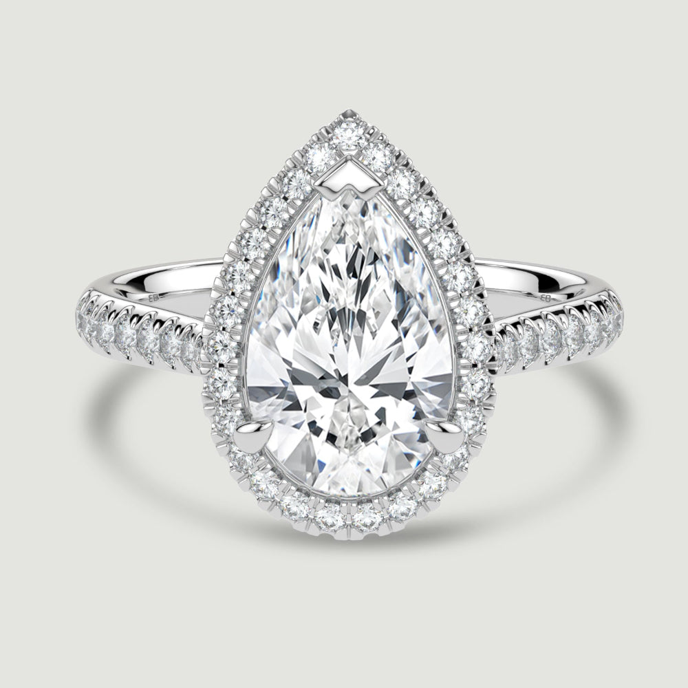 The Knightsbridge Pear Shape Diamond Engagement Ring with Micro-Pavé Set Halo and Shoulders