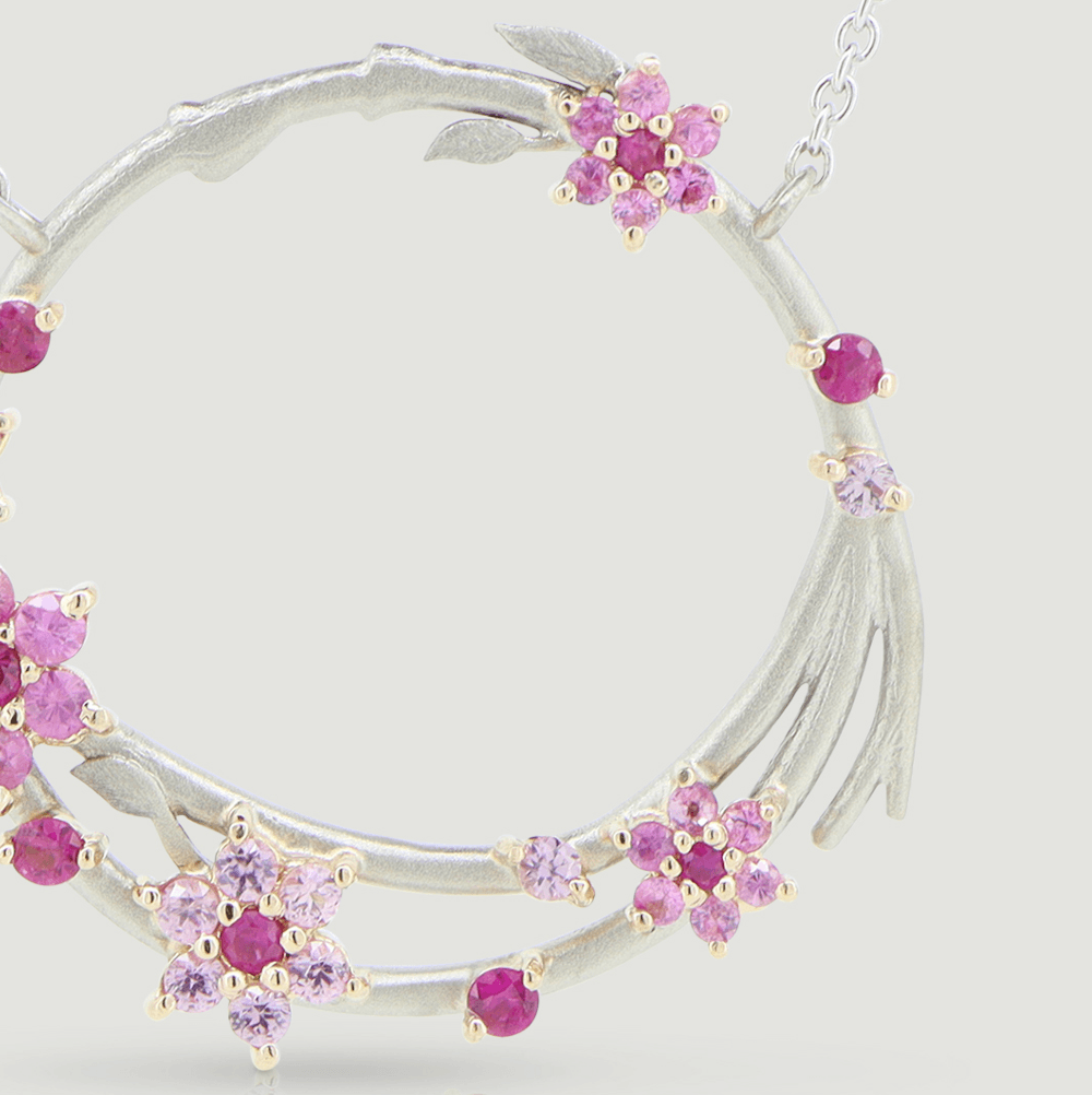 Introducing our Sakura Blossom Pendant, a tribute to Tokyo's cherry blossoms. Crafted with precision, the 23mm circular pendant features 41 pink sapphires totalling 0.67Ct, symbolising life and eternal love. Inspired by Japanese culture, this pendant hangs delicately on a chain, capturing the beauty and grace of cherry blossoms in full bloom. Embrace the elegance of Tokyo with this exquisite piece.