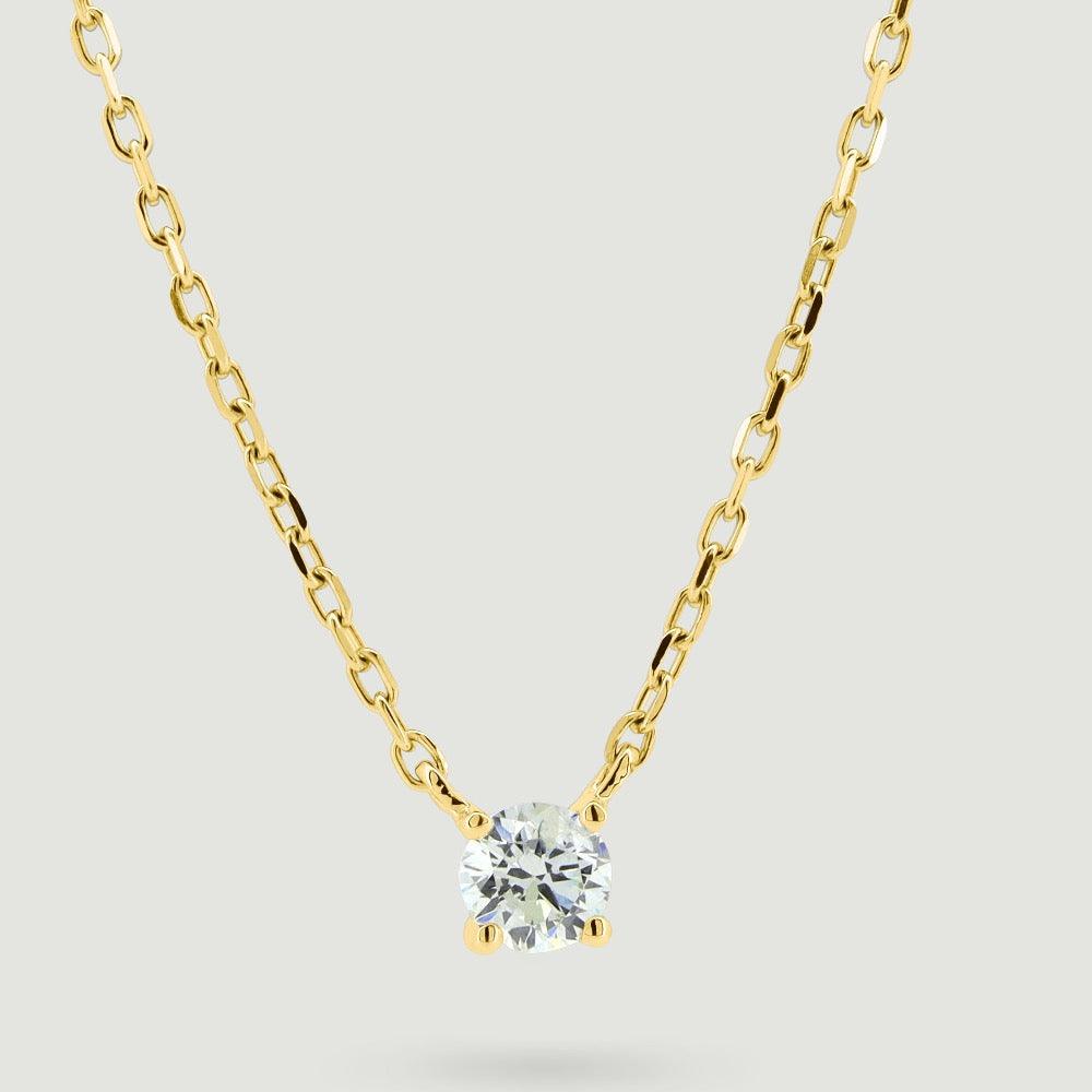 Beautifully secured in a delicate 18ct yellow gold four claw setting. This exquisite round diamond pendant adds a touch of sophistication to your neckline. The four claw setting is attached in the centre of a fine diamond cut chain that catches the light with every movement, creating a mesmerising sparkle.